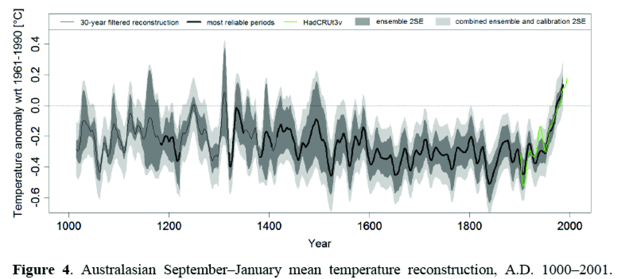 J. Gergis, R. Neukom, S.J. Phipps, A.J.E. Gallant, and D.J. Karoly, “Evidence of unusual late 20th century warming from an Australasian temperature reconstruction spanning the last millennium”, Journal of Climate, 2012, pp. 120518103842003-. DOI.
